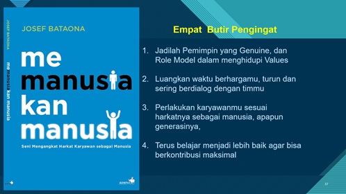 Saya sengaja menutup sesi hari itu, dengan memberikan empat butir rangkuman, yang bisa disimak di buku Memanusiakan Manusia, Seni Mengangkat Harkat Karyawan Sebagai Manusia.