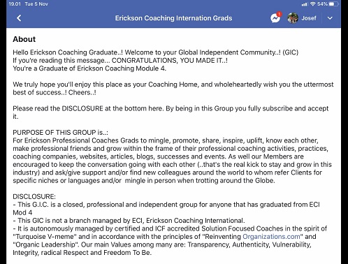 Gembira sekali bisa menjadi bagian dari network Coachnesia, yang merupakan bagian dari komunitas alumni Erickson Coaching di Indonesia. Disamping kegiatan yang dirancang lokal di Indonesia, kami juga merupakan jaringan alumni Erickson Coach International. Lihat pesan kepada anggota berikut ini.