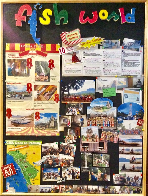 Panitia outing juga berkesempatan untuk memberikan laporan kegiatan outing. Dengan modal falsafah FishFun, Choose Your Attitude, kita bisa menyimak dari postingan tim di laman masing-masing, momen-momen penuh kegembiraan, terutama dalam kesempatan outing baru-baru ini. Tidak luput dari perhatian tim dengan rangkaian foto yang dihadirkan di dinding FishWorld berikut ini.