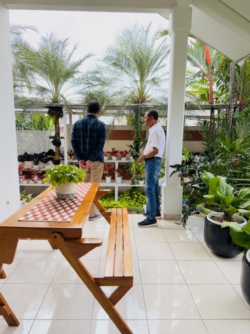 Setiba di rumahnya, beliau mempersilahkan saya masuk dan menjamu dengan secangkir teh hangat, kesan nyaman makin terasa ketika saya diajak ke bagian tengah rumah dimana terdapat area terbuka hijau dikelilingi tanaman hias mulai dari Anggrek, Antorium, Aglonema dan tanaman cantik lainnya, semua tertata dan serasi.