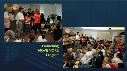 Di setiap momen saya deklarasikan komitmen olahraga saya dan juga mengajak karyawan kami untuk juga mempertimbangkan inisiatif seperti ini. Bersama pa Juli Triharto misalnya, kami memperkenalkan program “Move More” dengan menggunakan pedometer.