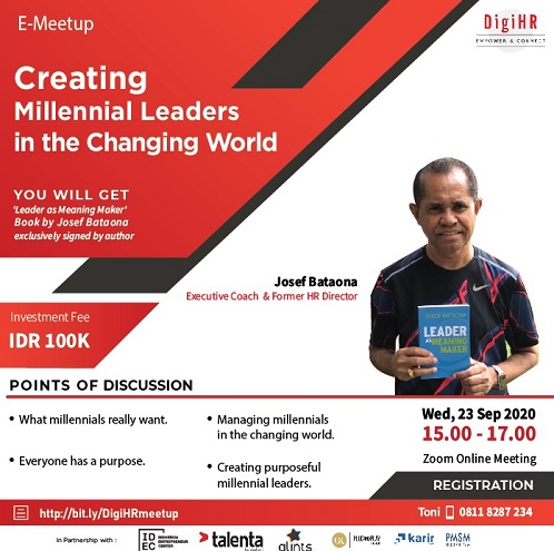 MILENIAL selalu menjadi topik menarik untuk dibahas. Berbagai sudut pandang digunakan untuk memotret kehadiran mereka di tengah industri. Banyak survey juga sudah dilakukan untuk menganalisa perilaku mereka ditengah komunitas dengan berbagai generasi yang hadir. Berikut foto flier webinar yang mengambil judul Creating Millennial Leaders in the Challenging World.