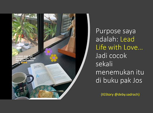 Karena itu dalam positingan IG Storynya, setelah menerima buku Leader as Meaning Maker, bu Deby Sadrach menghighlight judul tulisan ini: Sarapan pagi tadi ditemani buku ketiga pa Josef Bataona. Menurut beliau, bagian ini langsung menarik perhatiannya karena Purposenya bu Deby adalah: Lead Life with Love.